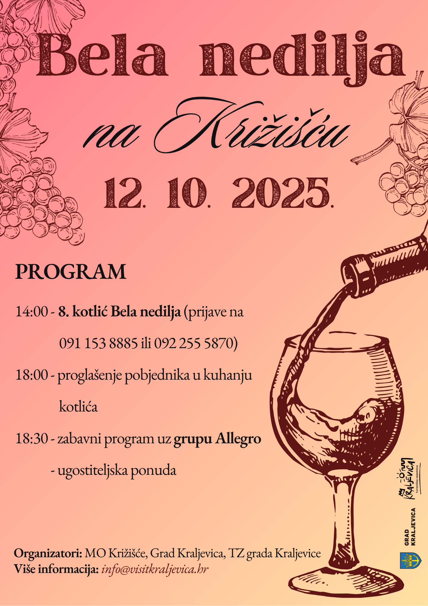 Program započinje u 14:00 sati tradicionalnim 8. kotlićem Bela nedilja, dok nas od 18:30 sati očekuje zabavni program uz grupu Allegro i bogata ugostiteljska ponuda.