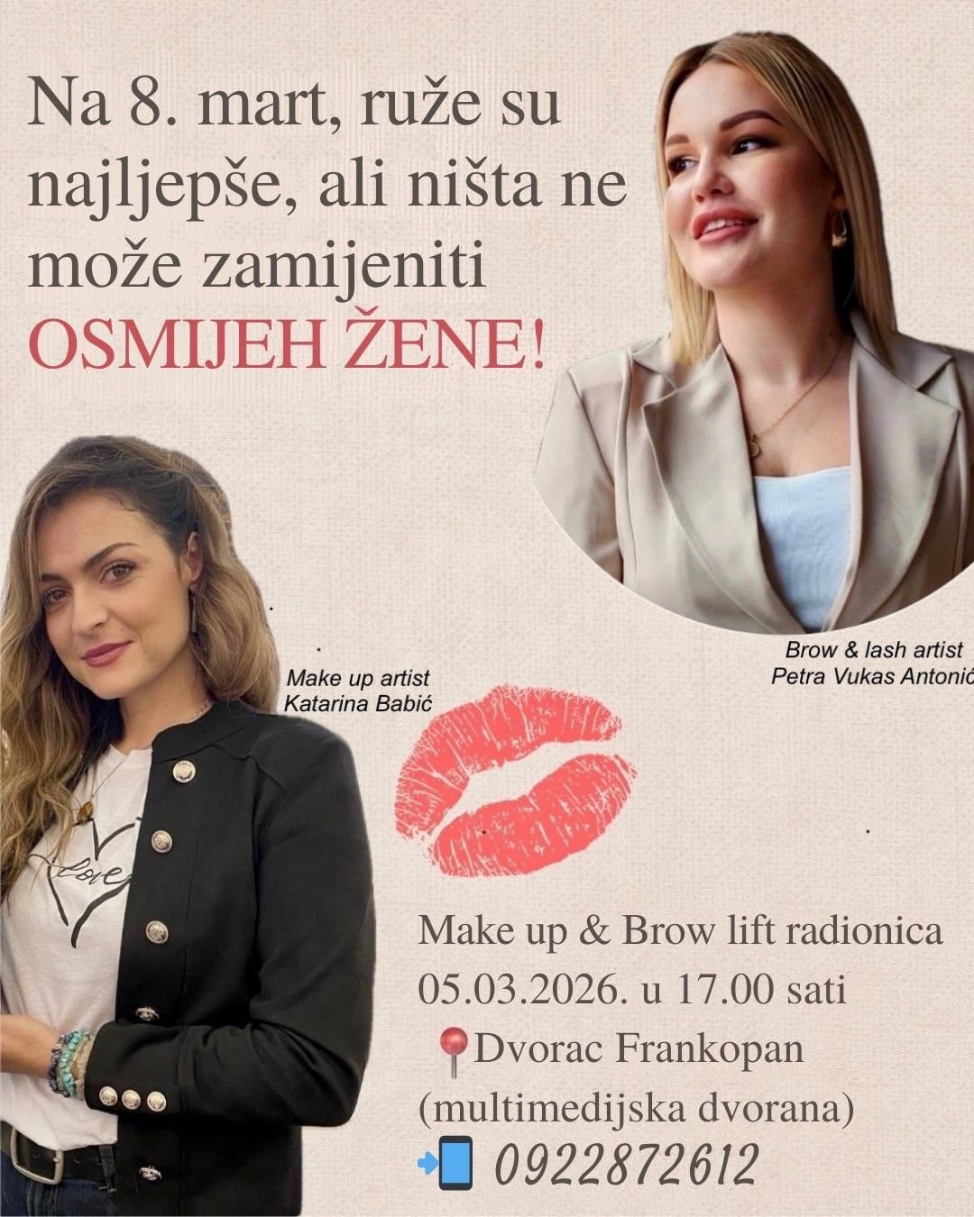 Prvi na redu je Ženski vikend u Frankopanu koji donosi program u povodu Dana žena. Četvrtak, 5. ožujka rezerviran je za Make up & Brow lift radionicu u organizaciji i pod vodstvom make up artistice Katarine Blažinić i Brow & lash artistice Petre Vukas Antonić. Cijena iznosi 60,00 EUR, a prijaviti se možete na broj 092 287 2612.